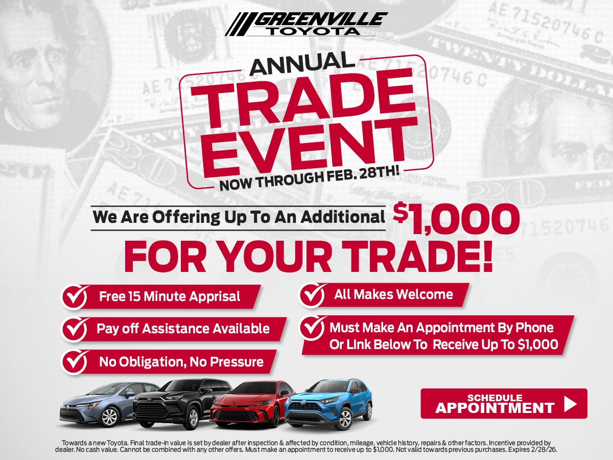 Towards a new Toyota. Incentive provided by dealer. No cash value. Cannot be combined with any other offers. Must make an appointment to receive $1,000. Not valid towards previous purchases. EXCLUDES TAX, TITLE, REGISTRATION, AND $798 DEALER FEE. SEE DEALER FOR DETAILS. EXPIRES 3/2/26.